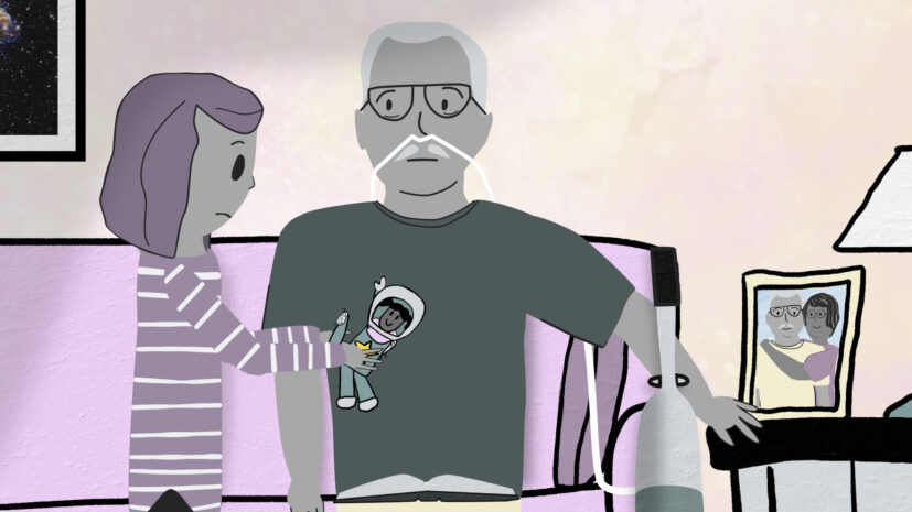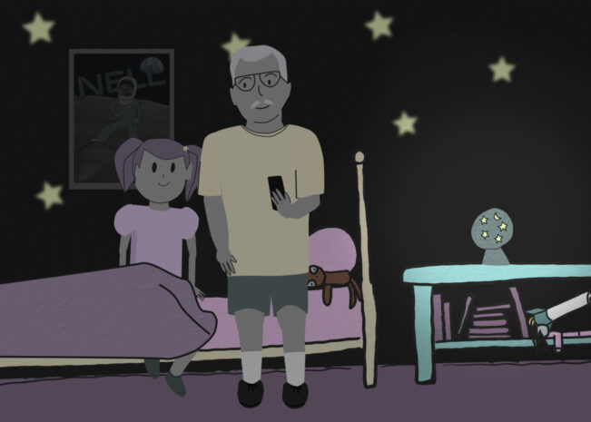 A grandfather takes his granddaughter on adventures in space, teaching her that we are all part of this great big universe.