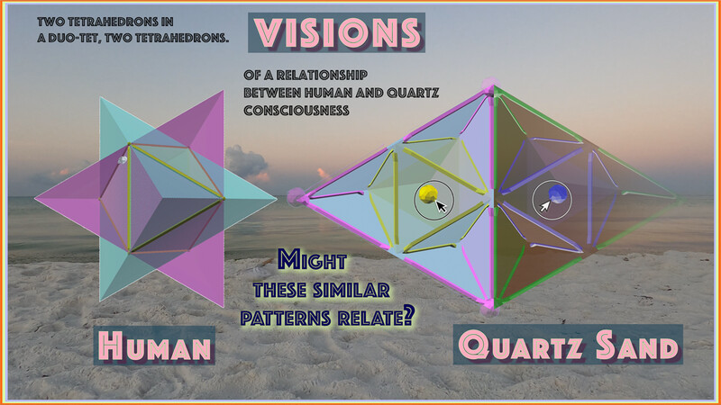 Visions of communicating ideas between sand and myself, shown as graphic images symbolized as duo-tets, two tetrahedrons. The HUMAN as a star octahedron that I suggest represents a structure of consciousness. It is a visionary Wholeo model. The QUARTZ SAND as tetrahedrons representing its silicon and oxygen atoms and their network link. It is a molecular model. I ask: “Might these two similar patterns relate?”
