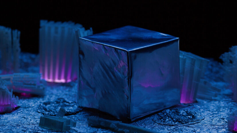 Light plays through translucent objects, and reflects off of silvery cubes. Light bubbles up and takes shape, making shapes. When rigid, geometric shapes are formed, their light is extinguished and their shape is crushed.